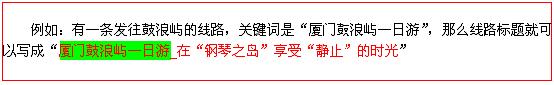 線路關鍵詞一定要出現在線路特色中——關鍵詞是以多種組合形式出現的(原詞完整出現、同義詞分散出現)——原詞也盡量出現在線路特色的最前面。(切忌堆砌關鍵詞)