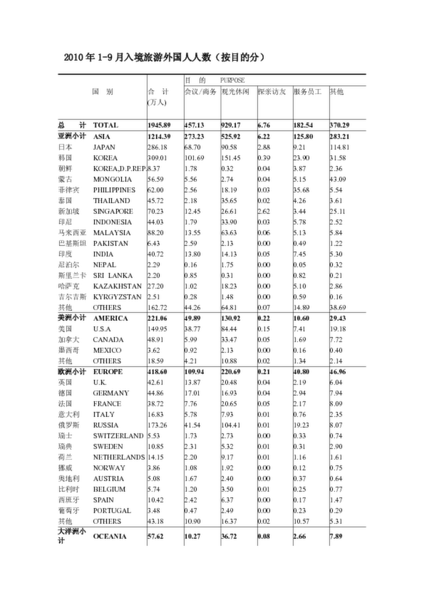 2010年1-9月入境旅游外國(guó)人人數(shù)(按目的分)